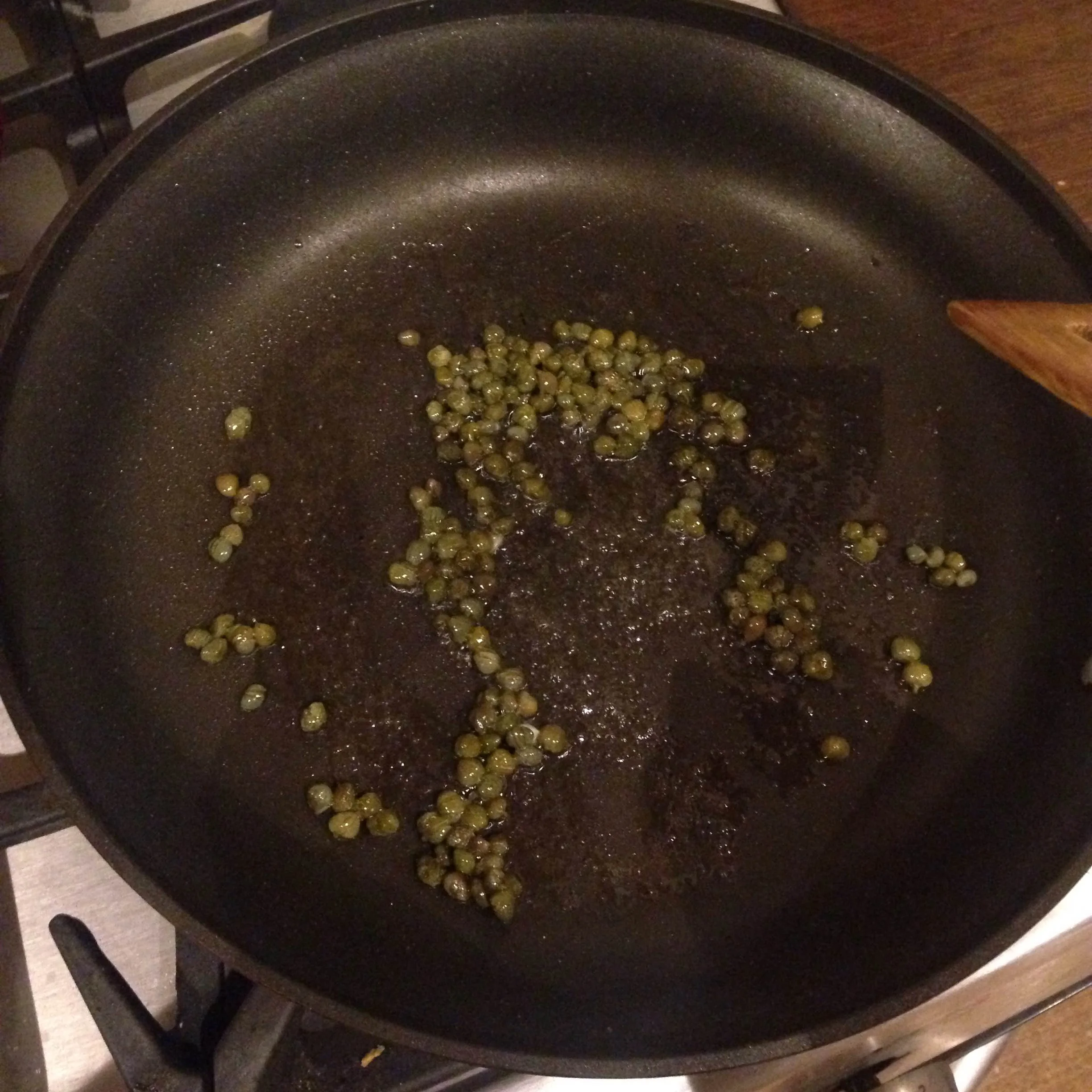 - On a pan add 2 teaspoons of olive oil and cook your capers for 3 minutes. Grab them with something that will allow the excess oil to stay on the pan and set them on a plate with a paper towel to soak up the olive oil