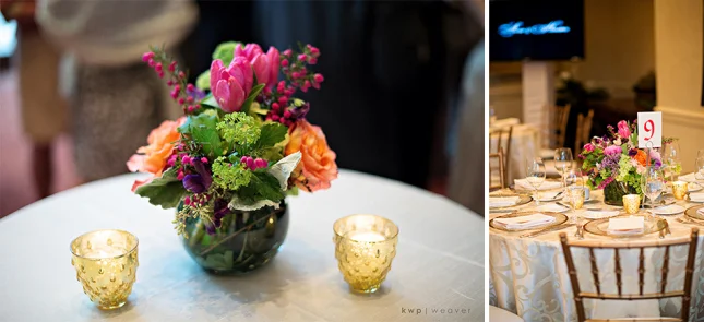 One of my brides struggles was figuring out what to do with her table decorations. Since the tables are not set with place settings, her initial idea to have navy blue napkins to add a pop of color was out (typically for a cocktail style reception utensils and napkins are found at each food station). Plus with the table being bare of any silverware, glassware, chargers or plates, she wanted to make sure the table didn't feel empty when guests initially enter the reception site.